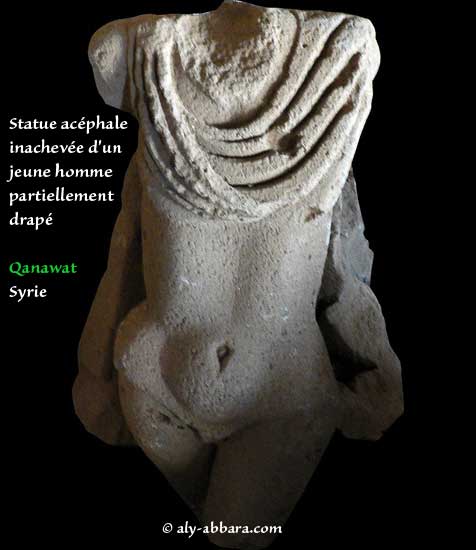 Fragment d'une statue inachevée d'un jeune homme partiellement drapé