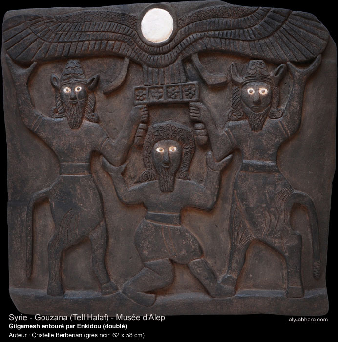 | L’œuvre de la l'artiste sculptrice " Cristelle Berberian " ; il s'agit d'une stèle représentant le roi Gilgamesh entouré de son ami Enkidou (doublé) Grès noir : 58 cm x 62 cm Copie d'une oeuvre originale trouvée à Gouzana (Tell Half) en Syrie et actuellement exposée au musée archéologique d'Alep |