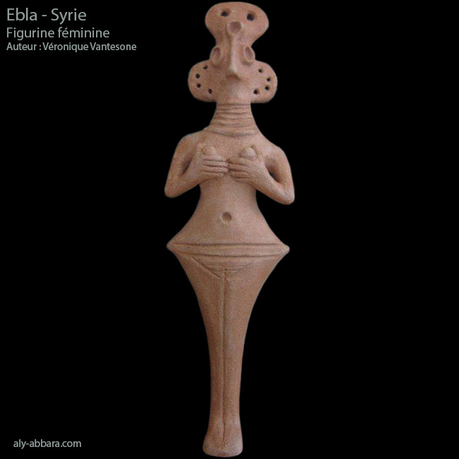 | L’œuvre de la l'artiste sculptrice " Véronique VANTESONE " ; il s'agit d'une figurine féminine répresentant la déesse de la fertilité à Ebla (Tell Mardikh aujourd'hui) (إيبلا ـ تل مرديخ) - Syrie (سوريا) ; ville prospère au cours du 3ème millénaire av. J.-C. Terre cuite patinée : H = 32 cm L’œuvre originale fait partie du patrimoine du musée national d'Idlib en Syrie Site du Dr Aly Abbara Mise à jour : 2 Octobre, 2013 museum.aly-abbara.com