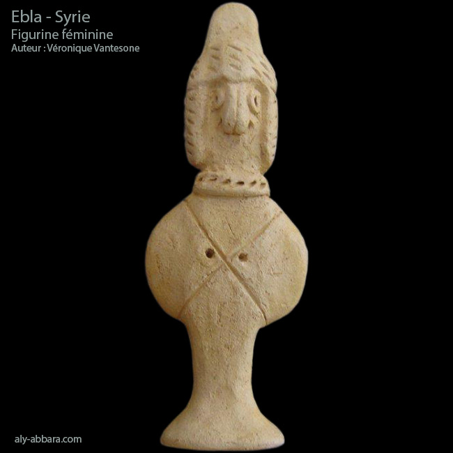 | L’œuvre de la l'artiste sculptrice " Véronique VANTESONE " ; il s'agit d'une figurine féminine répresentant la déesse de la fertilité à Ebla (Tell Mardikh aujourd'hui) (إيبلا ـ تل مرديخ) - Syrie (سوريا) ; ville prospère au cours du 3ème millénaire av. J.-C. Terre cuite patinée : H = 16 cm L’œuvre originale fait partie du patrimoine du musée national d'Idlib en Syrie Site du Dr Aly Abbara Mise à jour : 2 Octobre, 2013 museum.aly-abbara.com