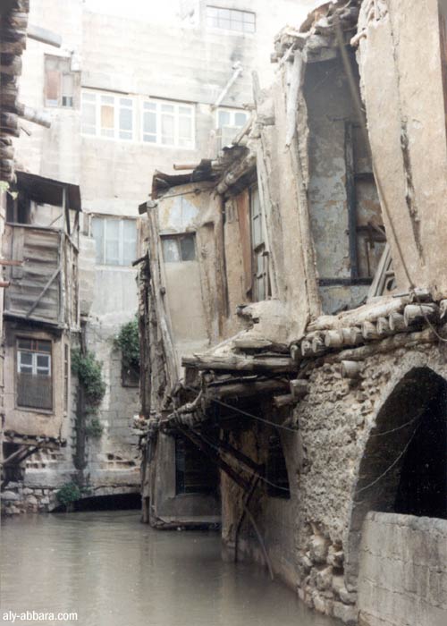 Une branche de la rivière de Barada circulant entre des vieilles maisons