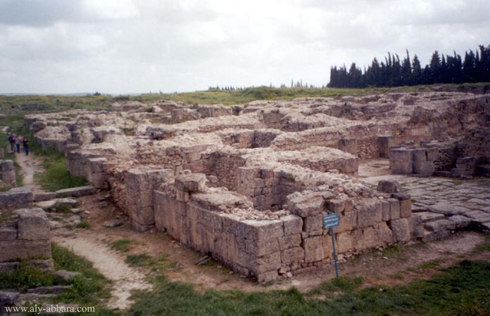 Ugarit - ruines - L'entrée du palais royal (à droite)- une rue juxtaposée - le temple palatial (à gauche)