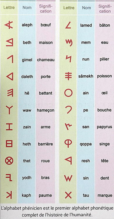 La chute et la disparition définitive de la ville d'Ugarit (détruite dans les premières années du Xlle siècle av. J.C.,) ont marqué la fin de cet alphabet uniforme. Mais l'invention elle-même, le principe de l'écriture alphabétique a survécu aux bouleversements qui ont affecté toute la côte au début du Xlle siècle av. J.C. et à l'invasion des « Peuples de la mer ». Vers l'an 1000 av. J.-C. à Byblos une inscription gravée sur un sarcophage atteste l'existence de l'alphabet Phénicien à cette époque. Entre le Xe et le VlIle siècle av J.C. I'alphabet a été aussi emprunté par les Grecs qui sont à l'origine de toute la tradition européenne tant latine que cyrillique tandis que l'alphabet araméen a donné naissance à tous les alphabets sémitiques actuellement en usage, arabe, syriaque ou hébreu. L'alphabet s'est ainsi répandu dans toute la Méditerranée et tout le Proche-Orient. (Référence du texte - UNESCO) |